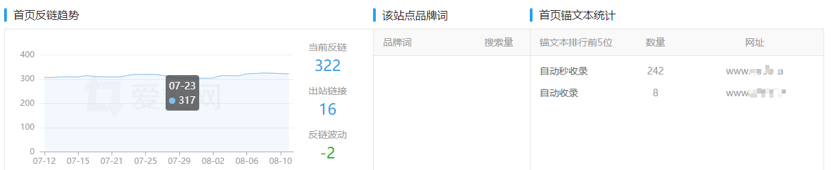 可以看到當前外鏈總數在322條,減掉出站鏈接16條(這部分預計是友情鏈接),還剩300+外鏈,預計是通過采購獲得。