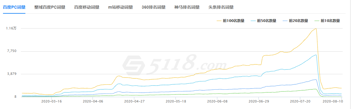 如下監控信息可以看出,采購外鏈的效果還是非常明顯的,網站的排名數據從6月開始一路向上;可惜到了8月,忽然回到開始的地方,估計是被發現了。